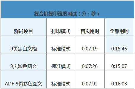 我們也測(cè)試了雙面打印速度,換算得到為60.5ppm,有略微的下降,不過仍然是很快的速度。柯尼卡美能達(dá)C658復(fù)印性能1頁到9頁換算得到為63.9ppm,也與標(biāo)稱值65ppm的復(fù)印速度接近。用ADF復(fù)印9頁彩色圖文,換算得到速度為59.4ppm,僅有略微下降,仍然是很出色的性能。
