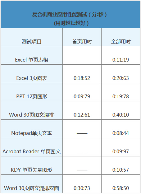 來看柯尼卡美能達(dá)復(fù)印機(jī)bizhubC658的輸出性能實(shí)測(cè)結(jié)果。單頁文件打印用時(shí)10秒左右,這還包括文件經(jīng)過印后處理組件的時(shí)間,非常快。而多頁Word、Excel和PPT文件打印速度換算得到為64.7ppm、62.5ppm和66.1ppm在標(biāo)稱值65ppm附近非常接近,有很高的打印性能。