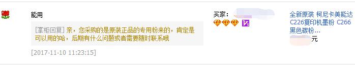 郝先生是在遼寧鞍山某設備節能有限公司工作的,公司用的是柯尼卡美能達C226復印機,近期提示要更換墨粉碳粉了,便在網上找到了我們家,并向客服細細的了解起了柯尼卡美能達復印機提示更換碳粉的問題,郝先生說這是他們用的第一臺復合機,以前用的都是黑白打印機,提示更換碳粉的時候有聯系過賣機器給他們的供應商,但他們的價格太貴了,所以才在網上了解,貨比三家,最后確定了在我們家購買。